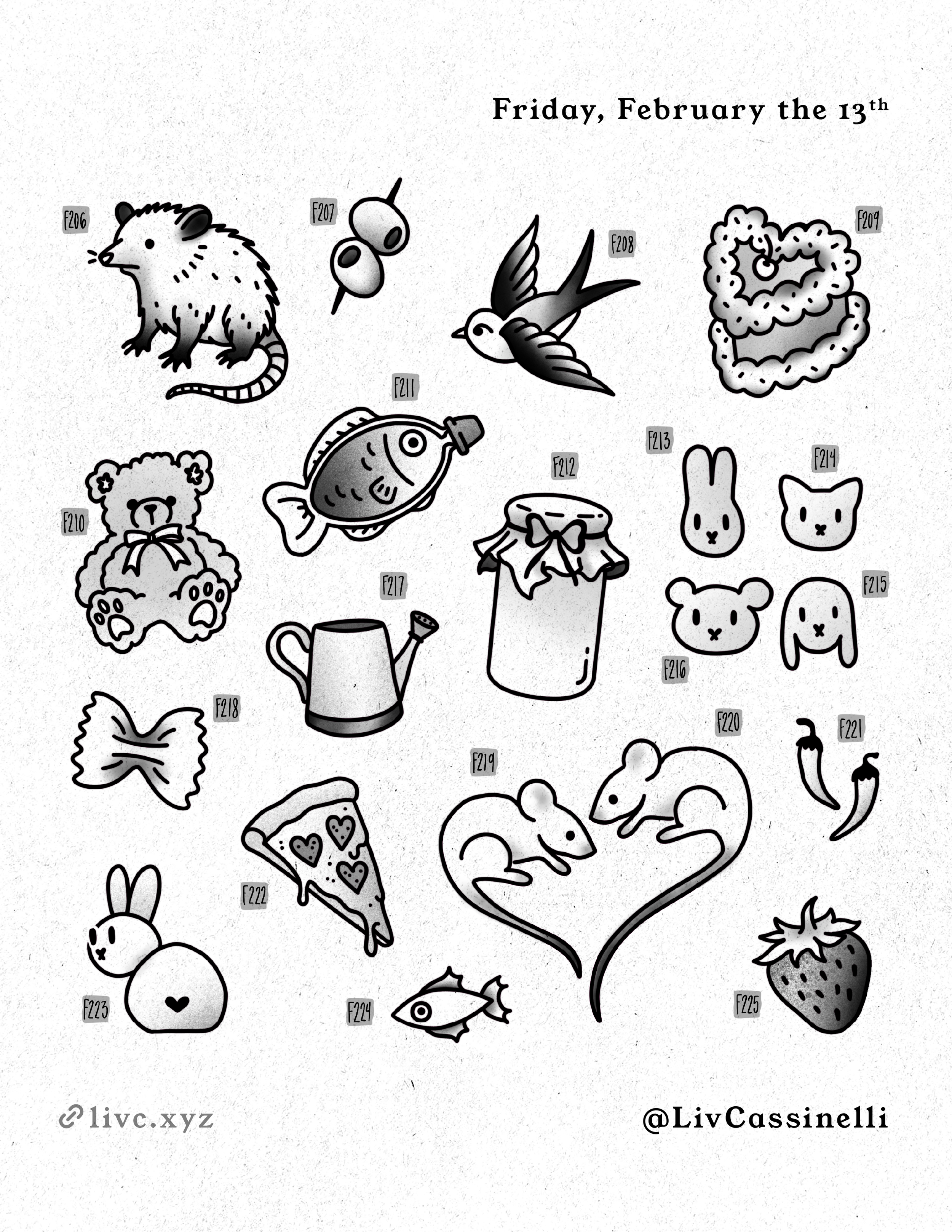 Most of these can be done in just linework, black & gray shading, or full color. All designs are able to be tweaked slightly (ex: change colors, change words, add sparkles, add flowers, etc.)